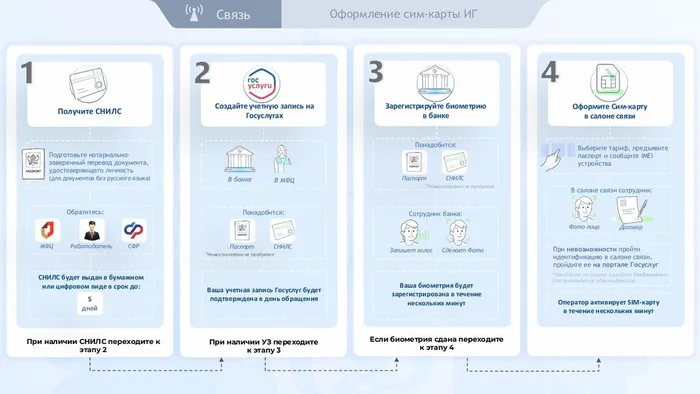 Иностранным гражданам, у кого уже есть сим-карты, нужно будет подтвердить личность в салоне связи до 1 июля 2025 года. Им понадобится СНИЛС, учётная запись Госуслуг, IMEI устройства и биометрия.